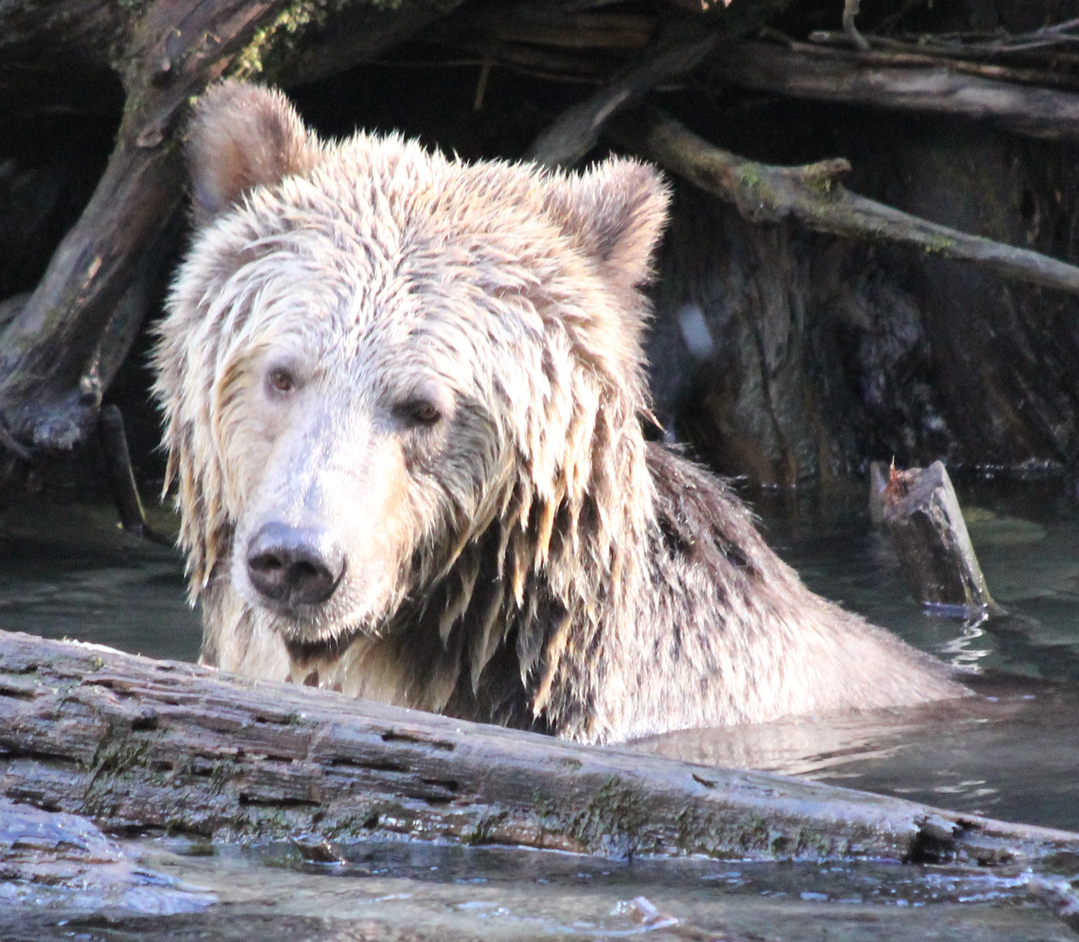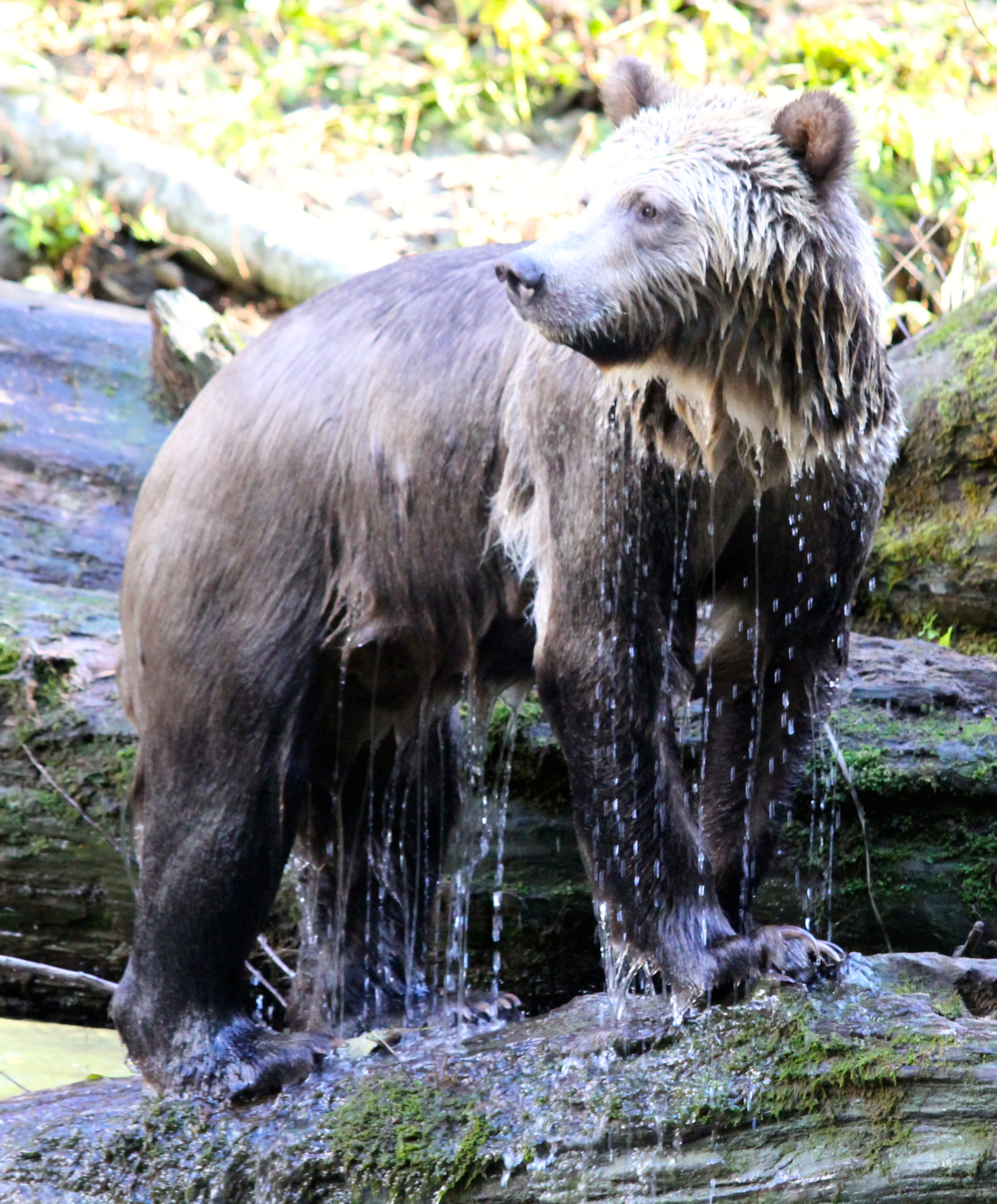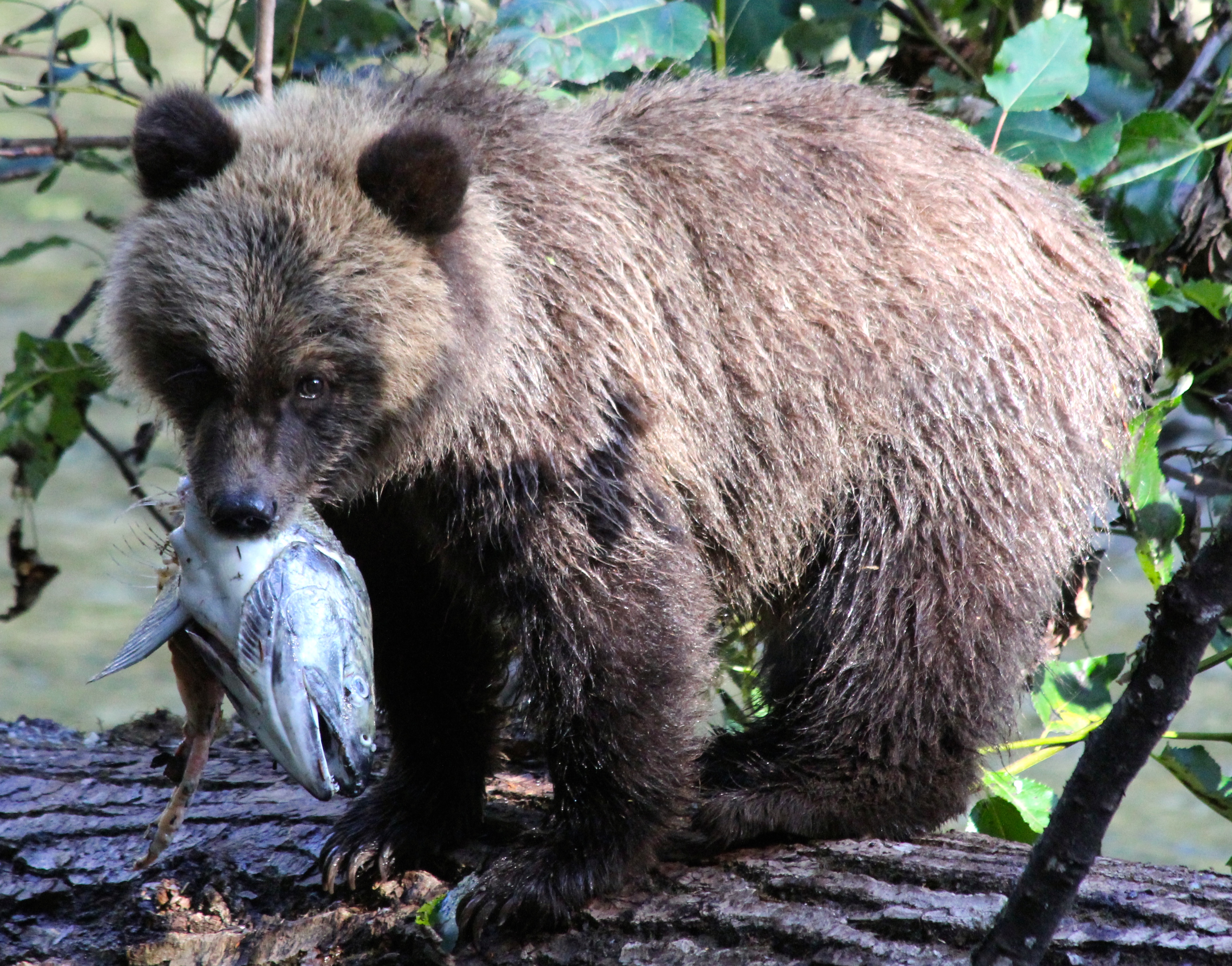 The first set of bears were a Mama and her 3 cubs. Typically it’s a Mum and only 2 cubs, so seeing her with 3 was something very special. About 10 minutes later ANOTHER mama and her THREE cubs appear. The two Mom’s gave each other a bit of stink eye but both backed down and ate their salmon in peace from a modest distance away from each other. The first family decided to later leave the area. Cubs were on one side of us gawking tourists, and the Mama decided to walk the OTHER way. We were officially between a Mom and her cubs… not exactly what the “what to do if you encounter a bear book suggests..” I’m of course not sick all of a sudden and snapping away about 300 photos a second like the paparazzi! (along with our guide/owner and his mama jama camera) The Mom walked all around our bus as we stood our ground, then joined up with her brood and continued on her way, cubs in tow. You’ll see that photo below. They did not go far, just a little down stream where you’ll see a photo of the Mum leading her cubs down a log. Spectacular.