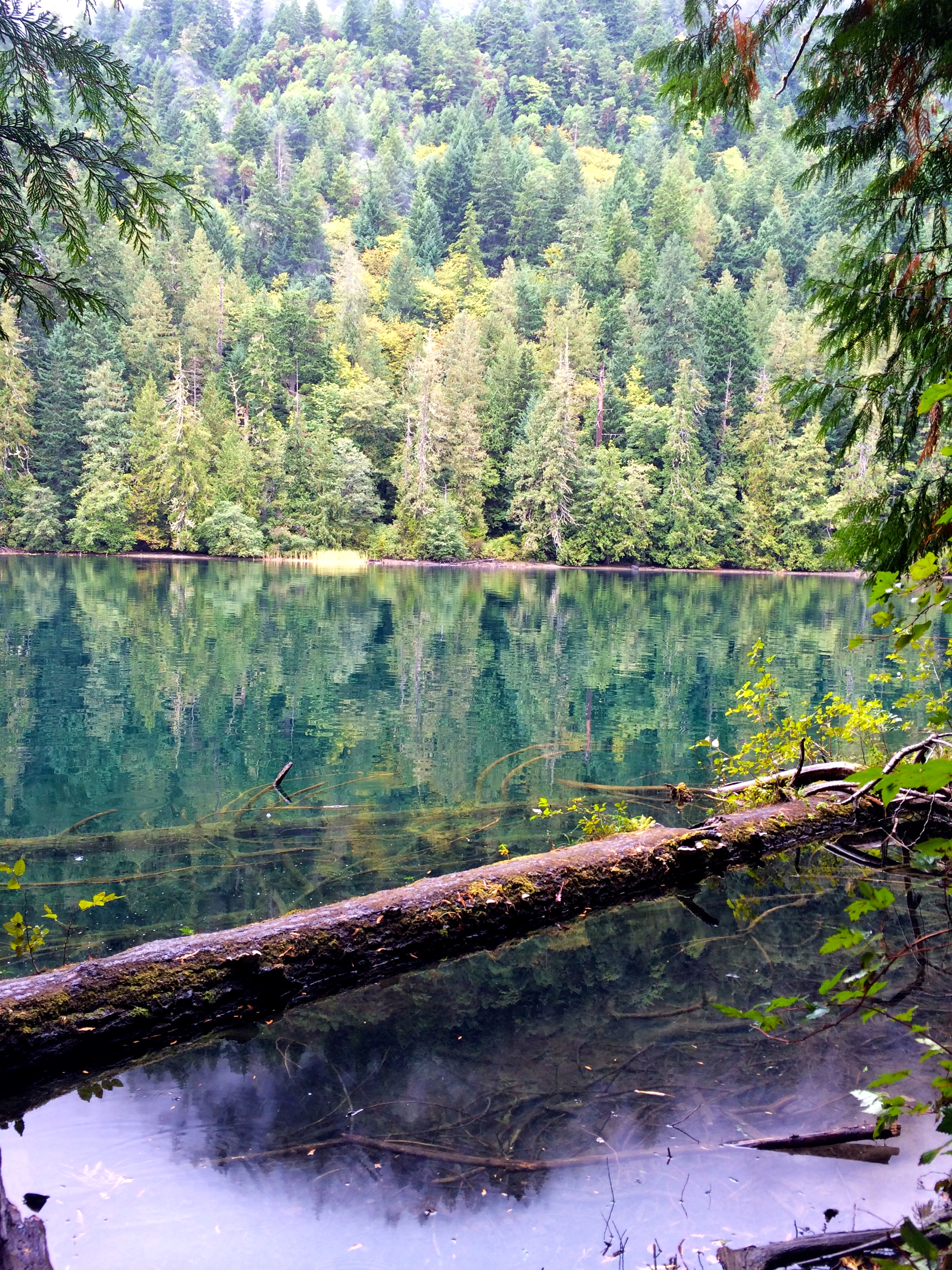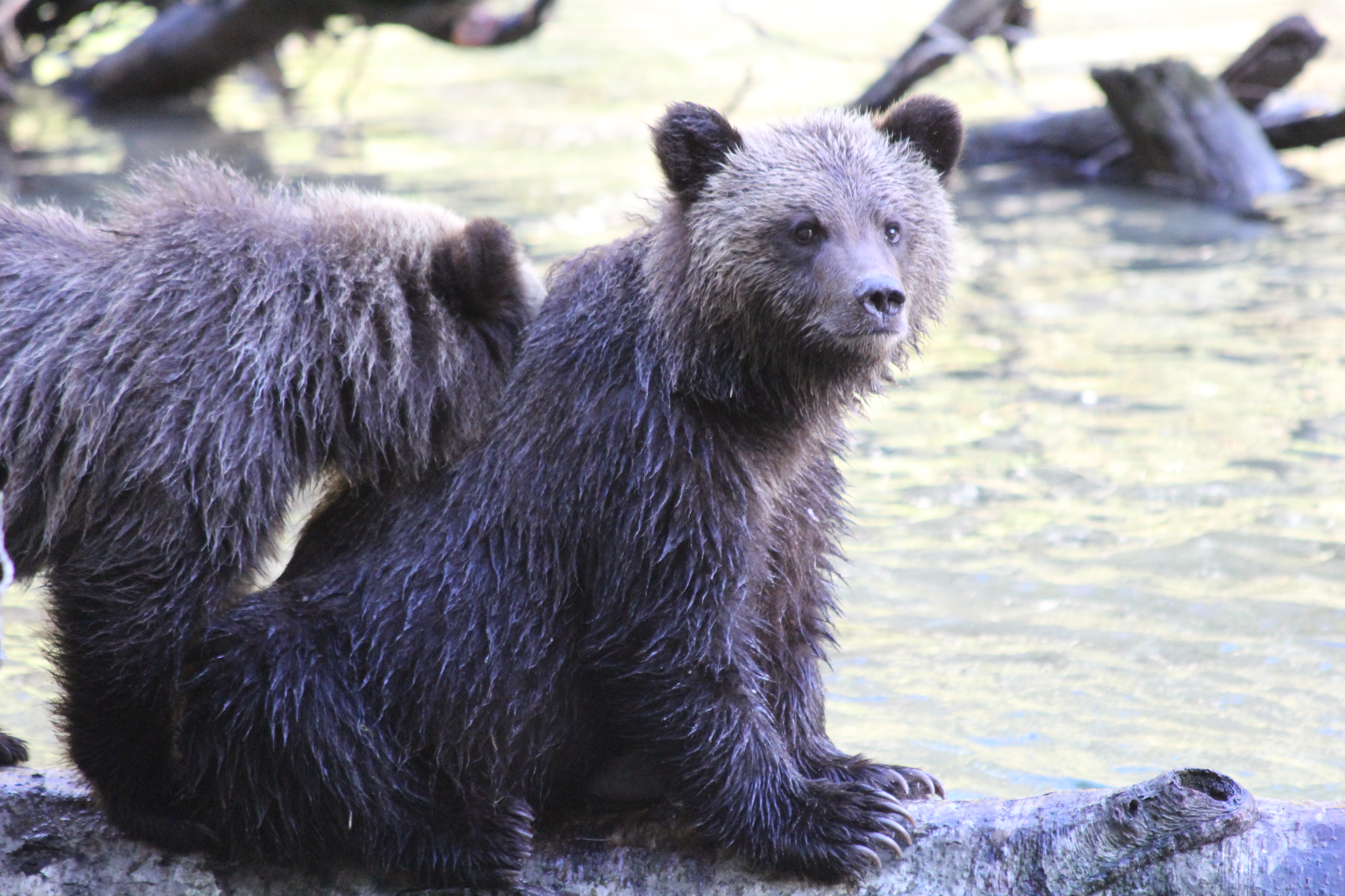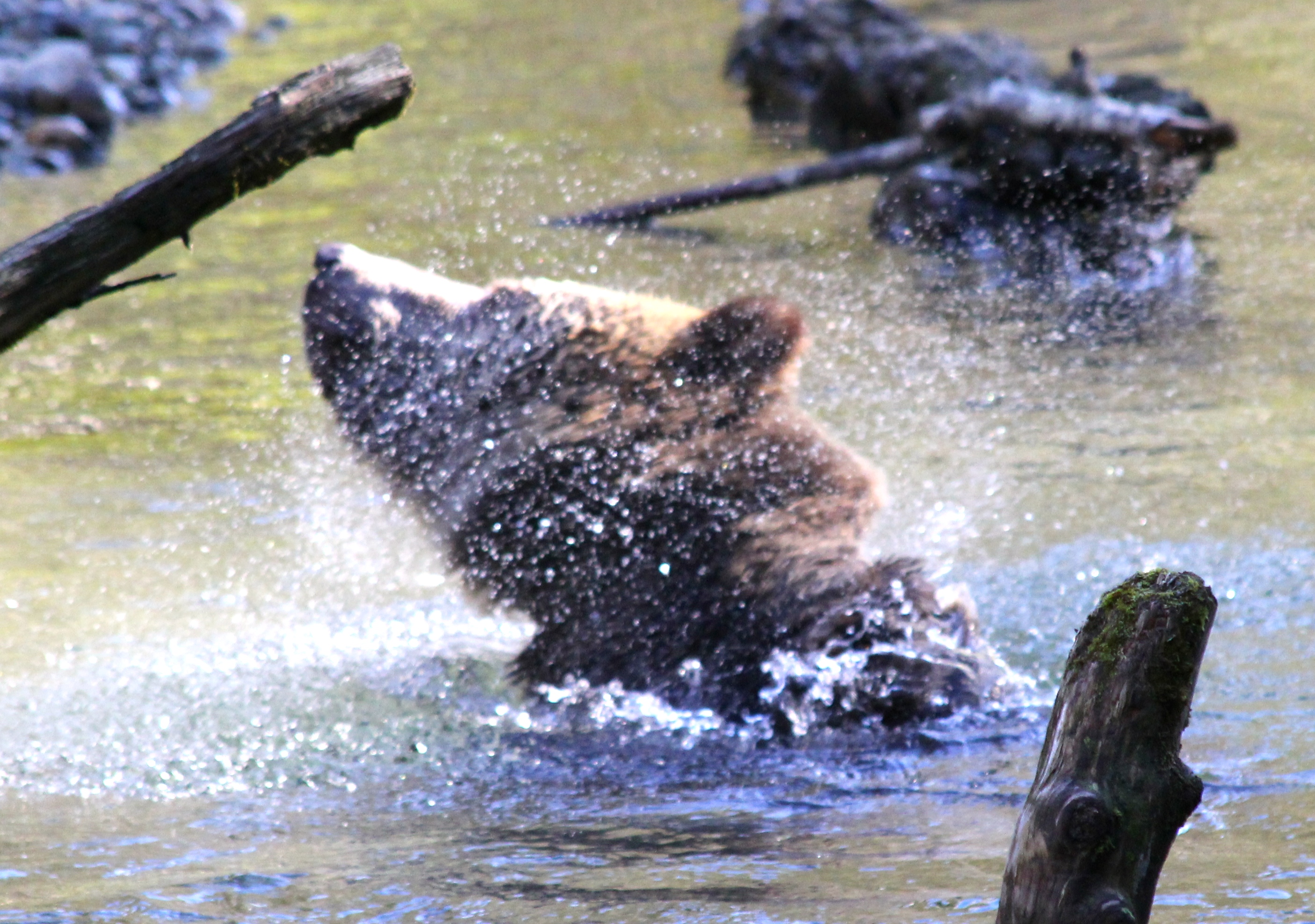 The first set of bears were a Mama and her 3 cubs. Typically it’s a Mum and only 2 cubs, so seeing her with 3 was something very special. About 10 minutes later ANOTHER mama and her THREE cubs appear. The two Mom’s gave each other a bit of stink eye but both backed down and ate their salmon in peace from a modest distance away from each other. The first family decided to later leave the area. Cubs were on one side of us gawking tourists, and the Mama decided to walk the OTHER way. We were officially between a Mom and her cubs… not exactly what the “what to do if you encounter a bear book suggests..” I’m of course not sick all of a sudden and snapping away about 300 photos a second like the paparazzi! (along with our guide/owner and his mama jama camera) The Mom walked all around our bus as we stood our ground, then joined up with her brood and continued on her way, cubs in tow. You’ll see that photo below. They did not go far, just a little down stream where you’ll see a photo of the Mum leading her cubs down a log. Spectacular.