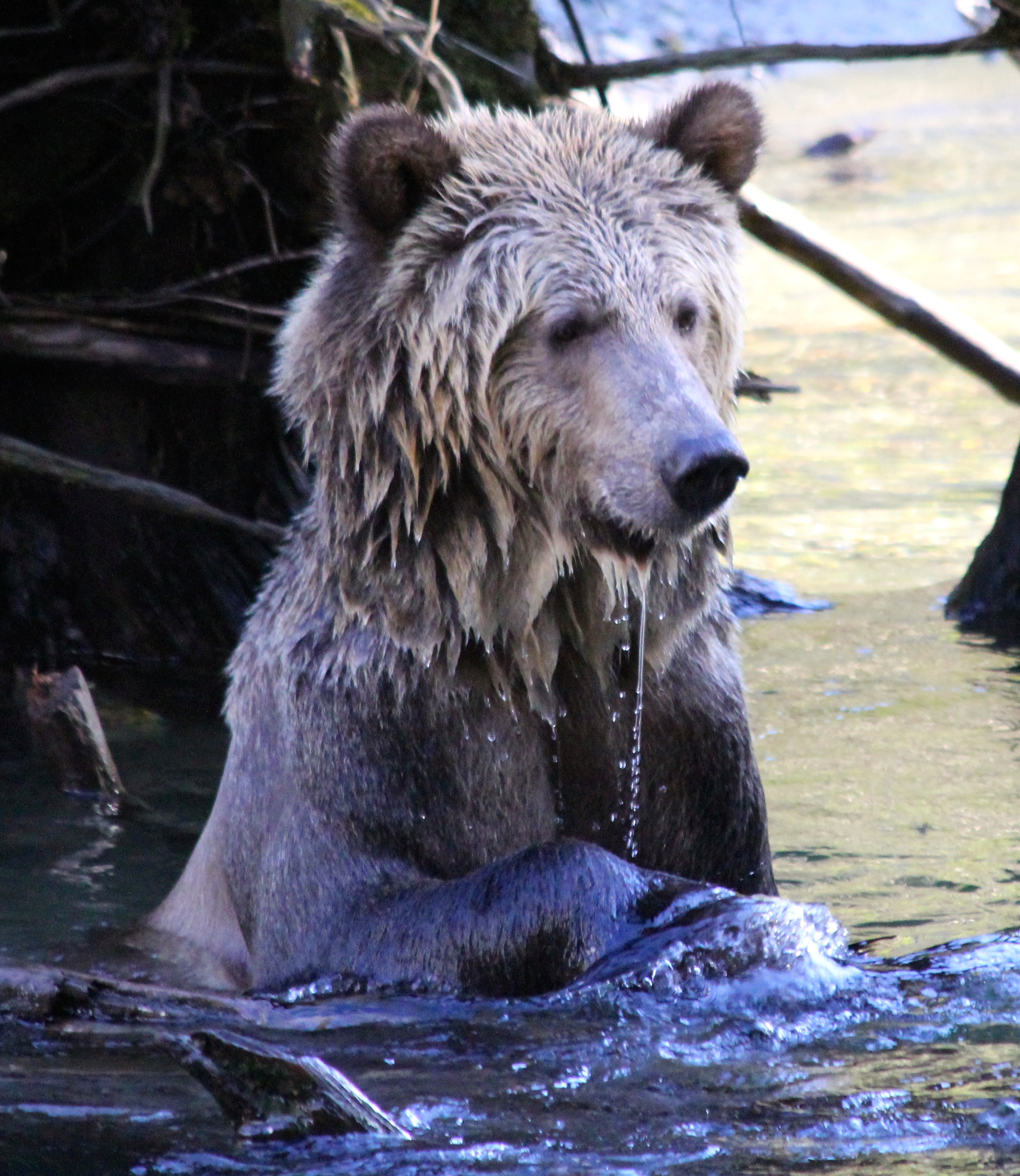 He hopped over the log, Mama stood up on her hinds and man that dude took one look at the Mama and booked out there so fast! (they must be Ex’s or something..? ) He only exited the area a few hundred feet down stream and began fishing. He kept his face buried deeply into the water peering and pawing around for salmon. All the while strutting around on a log showing off his masculine physique. He was certainly handsome and charming.